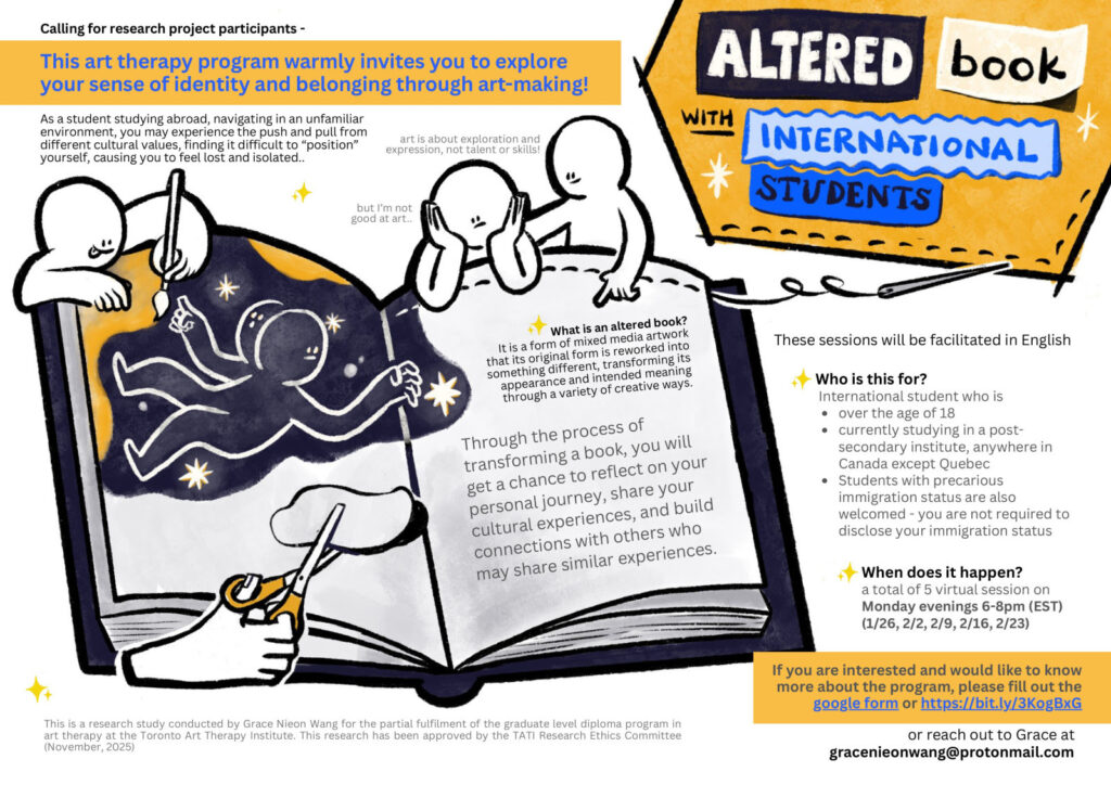 TATI student Grace Nieon Wang will be running an online art therapy group that involves altered book making! This research program warmly calls for international students who are currently studying in a Canadian post-secondary institution to join a supportive and welcoming space to explore their sense of identity and belonging. Through altered book making and visual journaling, participants will have the opportunity to reflect on their personal journey, share their cultural experiences, and build connections with others.